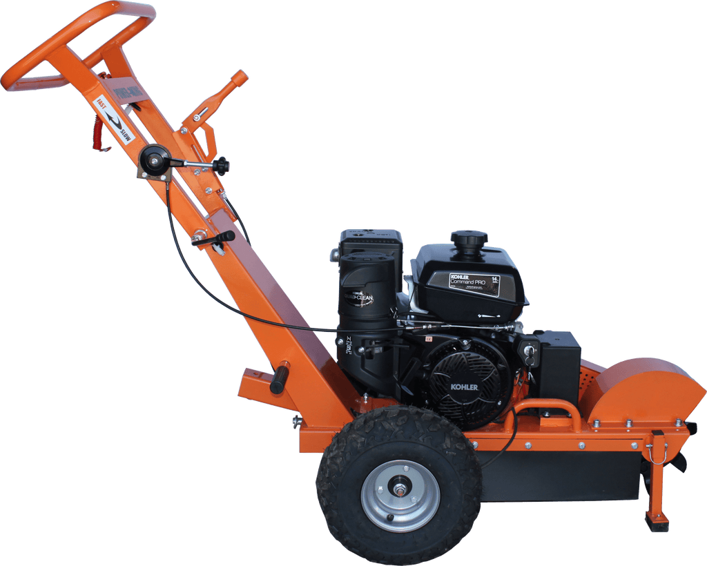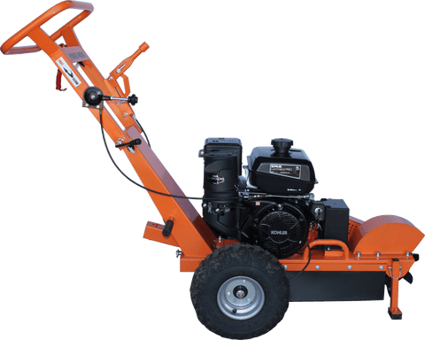 The Power King PK0803-EH 14Hp stump grinder has the power to obliterate anything in its way. This unit is powered by Kohler's Command PRO 14HP CH440 that includes a 3-year warranty. This powerful engine can be turned on with the twist of the key with the new electric start feature. The 14HP engine powers dual V-belts which rotates the 9 carbide tipped cutting teeth at a high rate of speed. The teeth branch out in 3 directions for a wide cutting path for faster grinding. The cutting wheel now support GreenTeeth 500 Series Lo-Pro. Includes an All-Weather cover for storage. Water resistant and UV/UVB resistant. Features an hour meter for following the maintenance schedule, adjustable handle for better control, drum brake to pivot while grinding, easy to reach throttle, clutch for easy starting and safety, front stand to protect teeth when storing, debris guards for protection, a palm stop switch and emergency pull. All backed by Power Kings great customer service, 1 year chassis, and 3 year Kohler engine warranty. Includes tow bar and extra set of teeth.